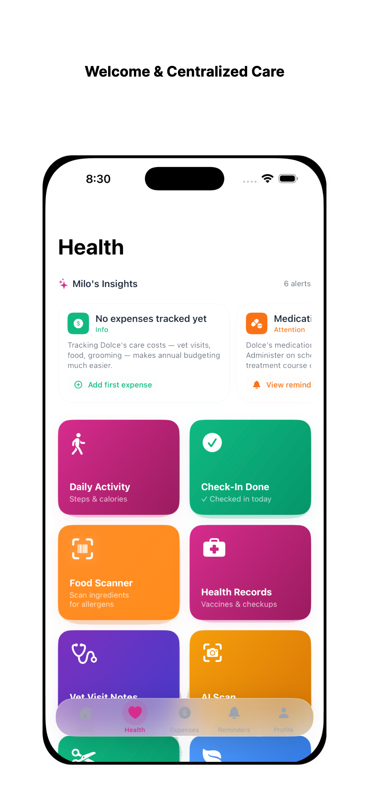 Track medications, vaccines, and daily care with help from Milo.